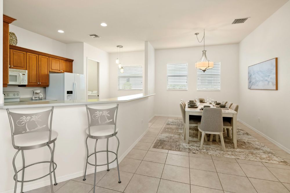 Step inside to find a bright, open-concept layout with two separate living areas, high ceilings, and tile flooring throughout. The fully stocked eat-in kitchen features granite countertops, stainless steel appliances, and a breakfast bar, perfect for cooking meals together before a day of exploring.
