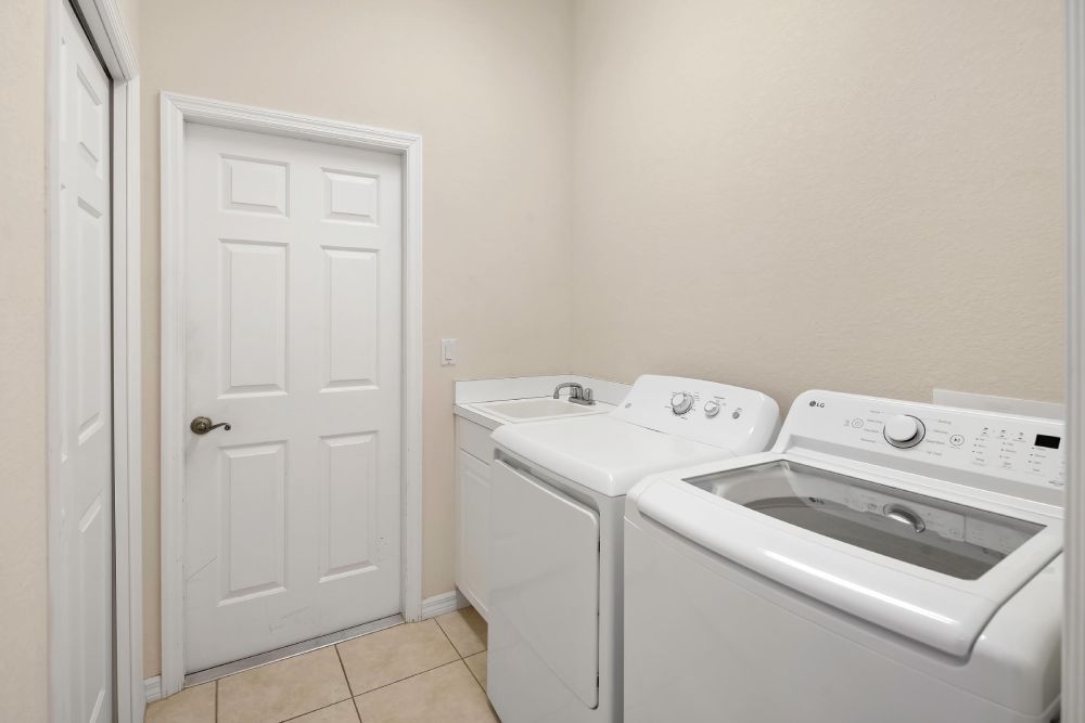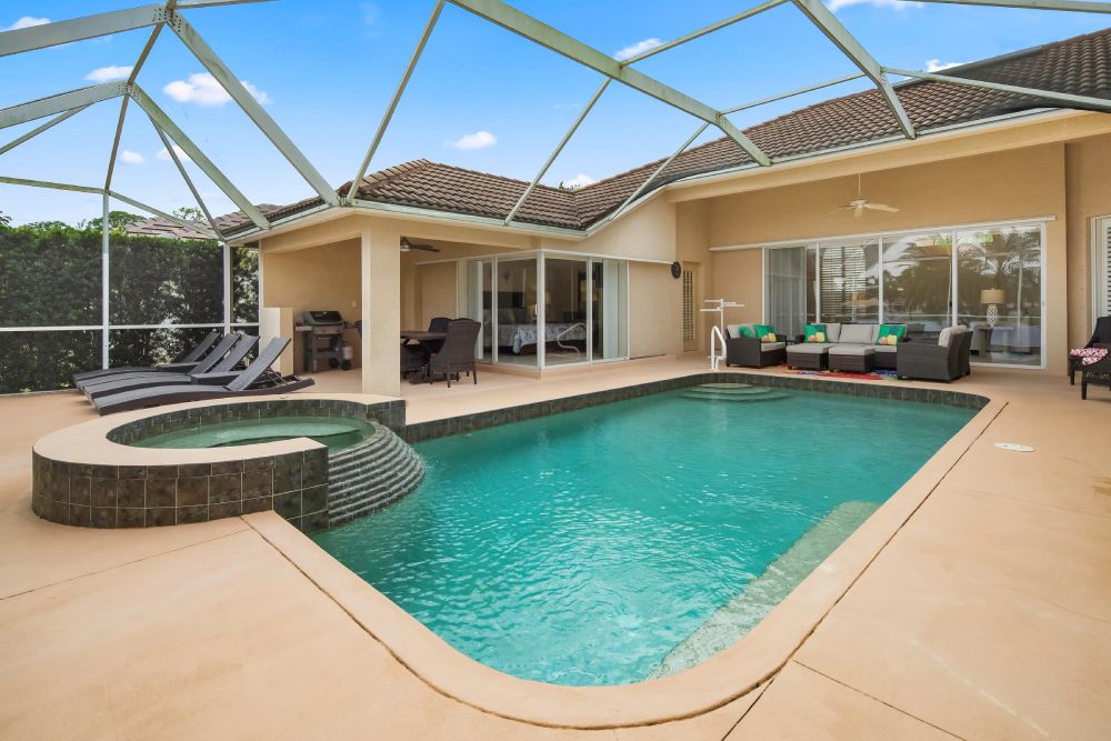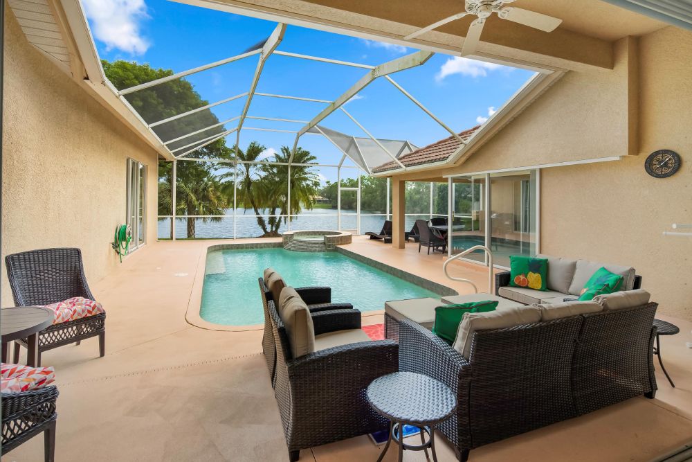 The private, screened-in lanai features a large heated pool, outdoor dining area, and a tranquil backyard with lake views. Whether you’re enjoying coffee by the pool in the morning or grilling dinner al fresco, the outdoor space is a true highlight.