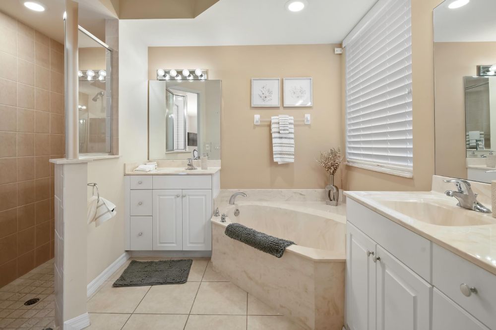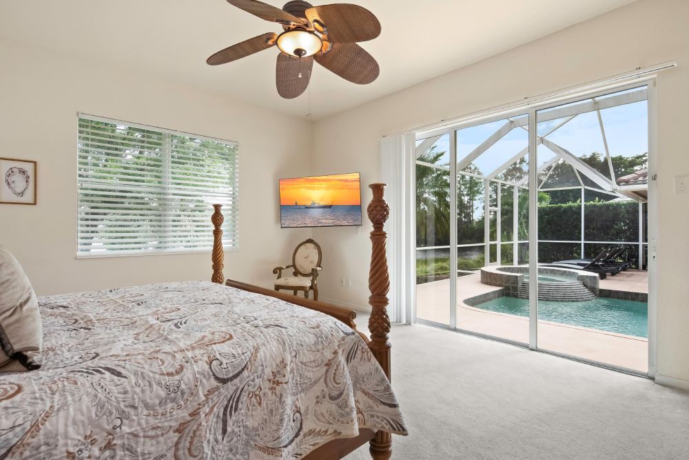 • Primary Suite with king bed, walk-in closet, dual vanities & direct pool access